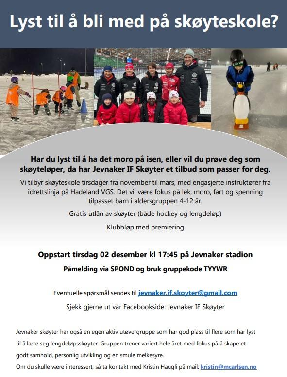 Har du lyst til å ha det moro på isen, eller vil du prøve deg som skøyteløper, da har Jevnaker IF Skøyter et tilbud som passer for deg.